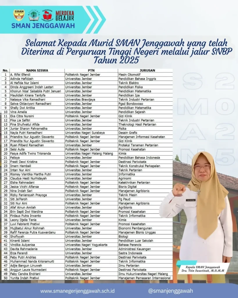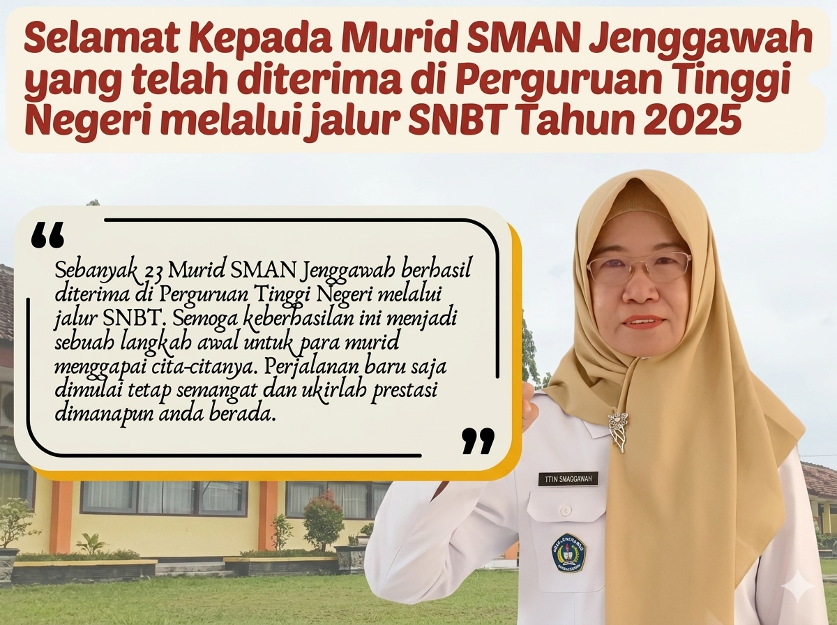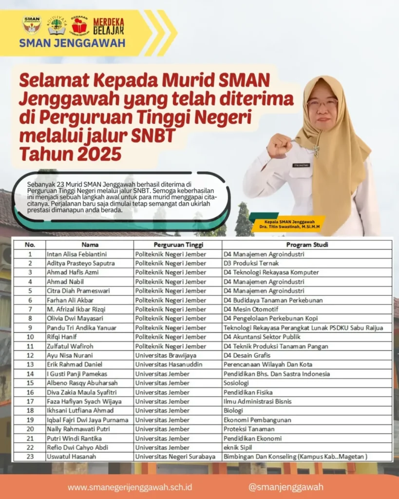 SMAN Jenggawah kembali menunjukkan kualitasnya sebagai salah satu sekolah unggulan di Kabupaten Jember. Sebanyak 23 murid terbaik kami berhasil diterima di berbagai Perguruan Tinggi Negeri (PTN) ternama di Indonesia melalui jalur Seleksi Nasional Berdasarkan Tes (SNBT) Tahun 2025. Keberhasilan para Lulusan SNBT SMAN Jenggawah ini menjadi langkah awal yang membanggakan bagi sekolah, orang tua, dan seluruh komunitas pendidikan. Pencapaian ini sekaligus membuktikan bahwa siswa kami mampu bersaing secara nasional di kancah pendidikan tinggi.